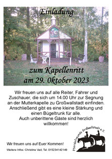 Die Pferdesegnung für alle Reit- und Kutschpferde findet am 30. Oktober 2022 um 14.00 Uhr an der Mutterkapelle in Großwallstadt statt.