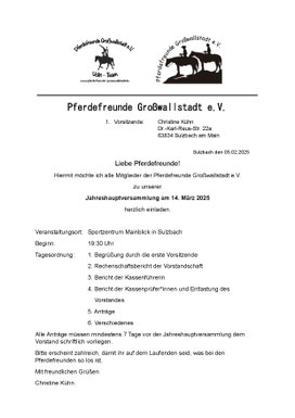 Bitte nehmt die Gelegenheit wahr, die Versammlung zu besuchen und euch zu informieren, was bei den Pferdefreunden so läuft.